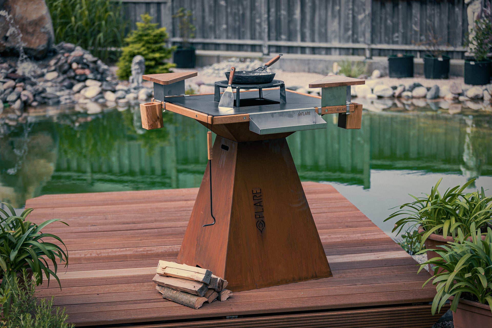 Die aus Stahl gefertigte quadratische Feuerplatte (80 x 80 cm) der FLARE 80 Serie ermöglicht gemeinsames Grillen und durch zusätzliche Temperaturzonen in den Ecken eine Vielzahl von Garmöglichkeiten. Durch das modulare Stecksystem ergeben sich mit einfachen Handgriffen verschiedene Varianten, sodass zum Beispiel durch Umdrehen des Sockels beim FLARE Grill “original” rasch eine bequeme Arbeitshöhe von 82 cm oder 100 cm erreicht werden kann. Bestehend aus: -Grillplatte 80 x 80 cm -Sockel: BxHxT 70 x 80 x 70 cm -Feuerschale BxHxT 75 x 30 x 75 cm -Feuerrost, Aschenbehälter -4 Stk. Griffleisten aus Hartholz; Länge: 860 mm inkl. Befestigungsmaterial Abmessungen: 90 x 90 cm H: 100 / 80 cm Gewicht: ~95 kg; Material: Stahl, Cortenstahl, Eiche |