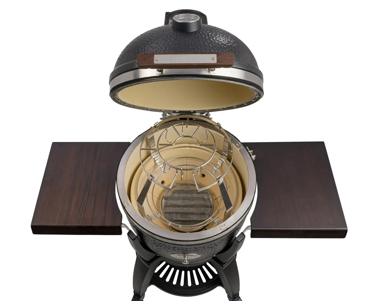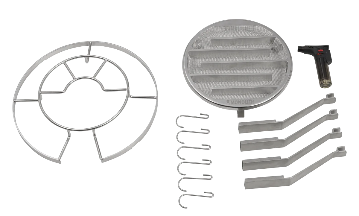 Räuchern auf höchstem Niveau – mit dem MONOLITH Smoke Set Mit dem innovativen Smoke Set präsentiert MONOLITH die perfekte Erweiterung für alle Grillfans, die ihren Keramikgrill zum professionellen Räucherofen aufrüsten möchten. Ob Kalt- oder Heißräuchern – dieses Zubehör eröffnet dir völlig neue Möglichkeiten beim Veredeln von Lebensmitteln direkt auf deinem MONOLITH Grill der Größe .55. Der hochwertige Spezialaufsatz aus massivem Edelstahl passt exakt auf das bewährte Smart Grid System. Dank seiner durchdachten Konstruktion mit vier stabilen Steckbeinen schafft er genügend Raum, um auch größere Räuchergüter wie Fisch, Fleischstücke, Käse oder Kräuter sicher und komfortabel aufzuhängen. Selbst empfindliche Zutaten wie Butter oder Salz lassen sich problemlos veredeln. Das Herzstück des Sets ist der integrierte Smoke-Generator, der durch den mitgelieferten Power-Anzünder schnell und gleichmäßig befeuert wird. So entsteht im Handumdrehen aromatischer Rauch – ganz ohne lange Wartezeiten.